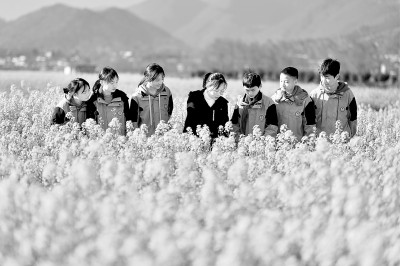 湖北省襄阳市保康县马良镇中心学校教师在农田里给学生讲解油菜的生长特性和用途。杨韬摄/光明图片