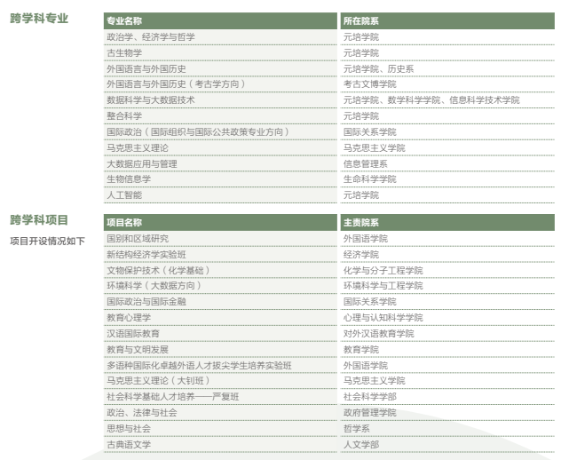 北京大学发挥综合性大学多学科优势,突破原有院系为基础的专业教育模式,进一步开放院系优质教学资源,学校鼓励学部、院系、研究中心及教师团队建设多层次、有特色的跨学科本科人才培养项目,包括跨学科专业、跨学科系列课程或模块等,完善多样化人才 培养体系,为学生提供多样化的选择空间。