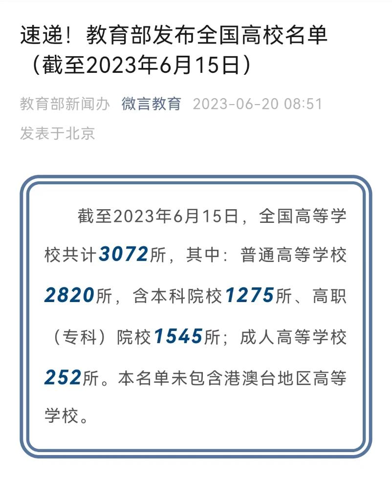 记者6月20日从教育部获悉,根据近日发布的全国高校名单,截至2023年6月15日,全国高等学校共计3072所,其中普通高等学校2820所,含本科院校1275所、高职(专科)院校1545所;成人高等学校252所。