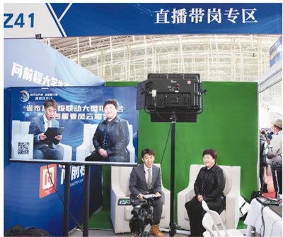 黑龙江省在哈尔滨市举办“省、市、县三级联动大型招聘活动暨第四届春风云聘会”,开展现场及线上招聘会500余场次。图为工作人员在招聘会的直播带岗专区直播。新华社记者 王建威摄