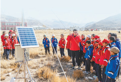 中科院珠峰站,工作人员给孩子们讲解科学仪器的功能作用。新华社记者 孙 非摄