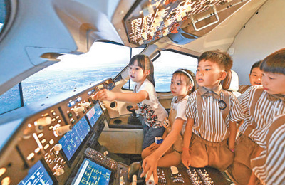 天津华夏未来儿童科技馆,孩子们体验模拟飞行。新华社记者 孙凡越摄