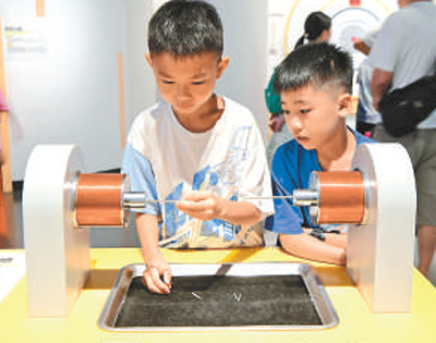 浙江省金华市科技馆,孩子们体验“搭建铁钉桥”。时补法摄(影像中国)