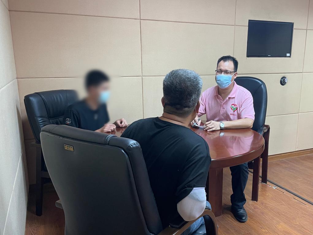伍家智与服务家庭成员面谈,分享亲子沟通技巧。(佛山市人民检察院供图)