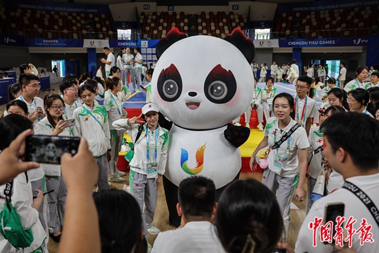 8月3日,四川省成都市城北体育馆,第31届世界大学生夏季运动会武术项目后,志愿者在和本届大运会吉祥物“蓉宝”合影留念。他们来自新闻、礼仪、场馆、安保等各个组别。中青报·中青网记者 赵迪/摄