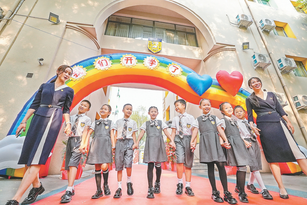 昨天,黄城根小学附属实验分校举办新学年开学典礼。在老师的陪伴下,孩子们穿越七彩校门走进校园,愉快开启新学期学习生活。记者 武亦彬摄