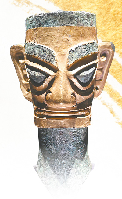 三星堆博物馆新馆的戴金面罩青铜人头像。新华社记者 刘 坤摄