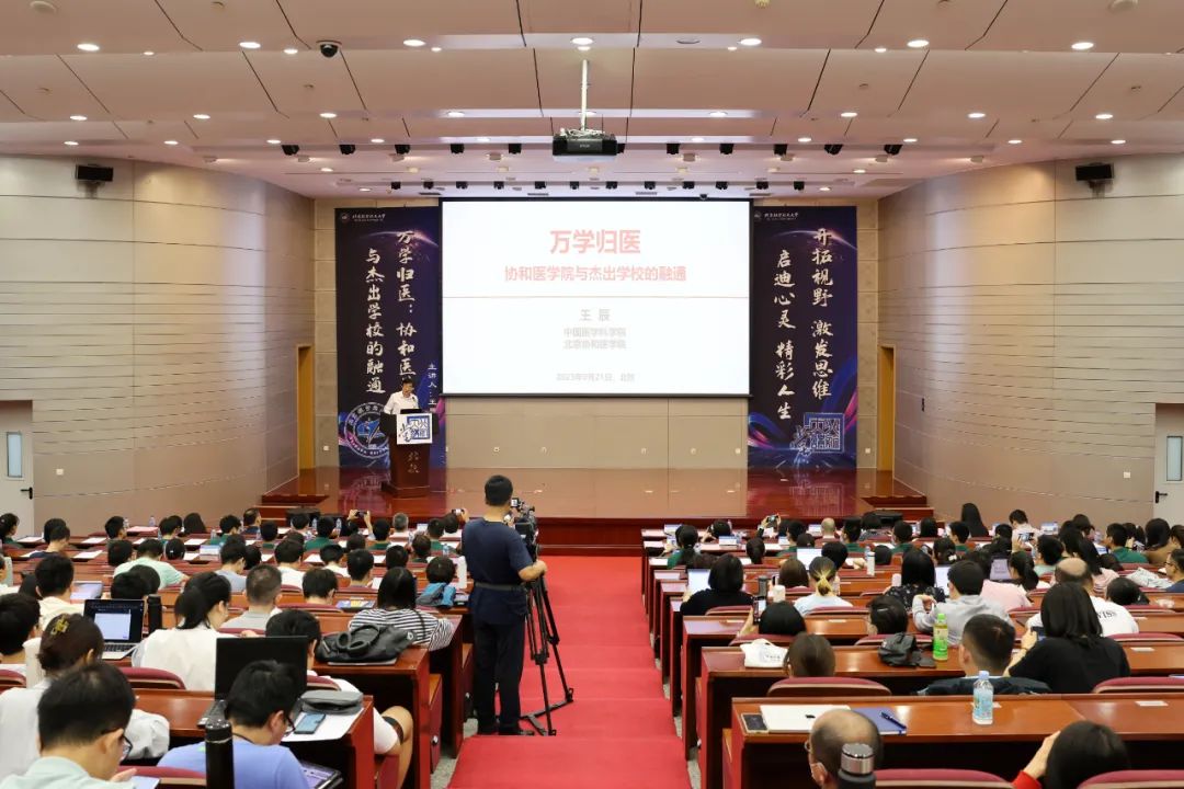 开班式结束后,王辰做客“北航大讲堂”,为学校近300名师生带来一场题为“万学归医,协和医学院与杰出学校的融通”的讲座。讲座中,王辰围绕“健康与生命是人的终极利益”这一核心主题,阐释了“健康”和“医学”的概念,指出医学是一个独特的、综合的、巨大的体系,并结合北航“协和医班”的实践,鼓励同学们共同投身医学这一神圣事业。