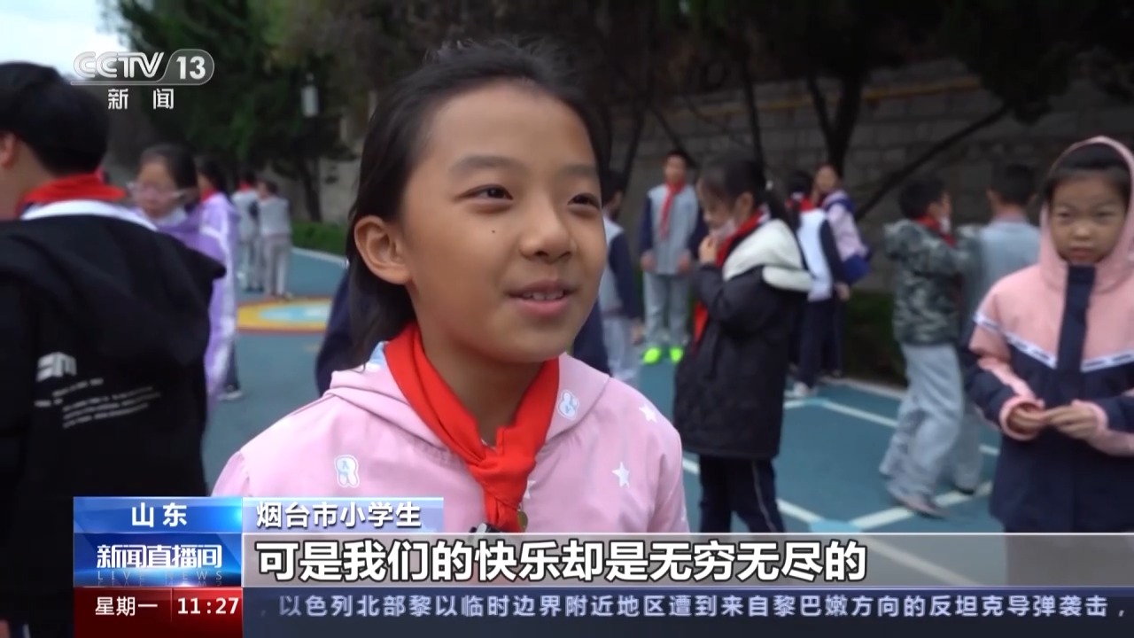江苏如皋市小学生 朱卉钰:我感觉一下课出来玩,可以在外面玩玩游戏,在外面跑一跑就特别舒服。我希望下课的时间再长一点,可以再玩一些游戏。