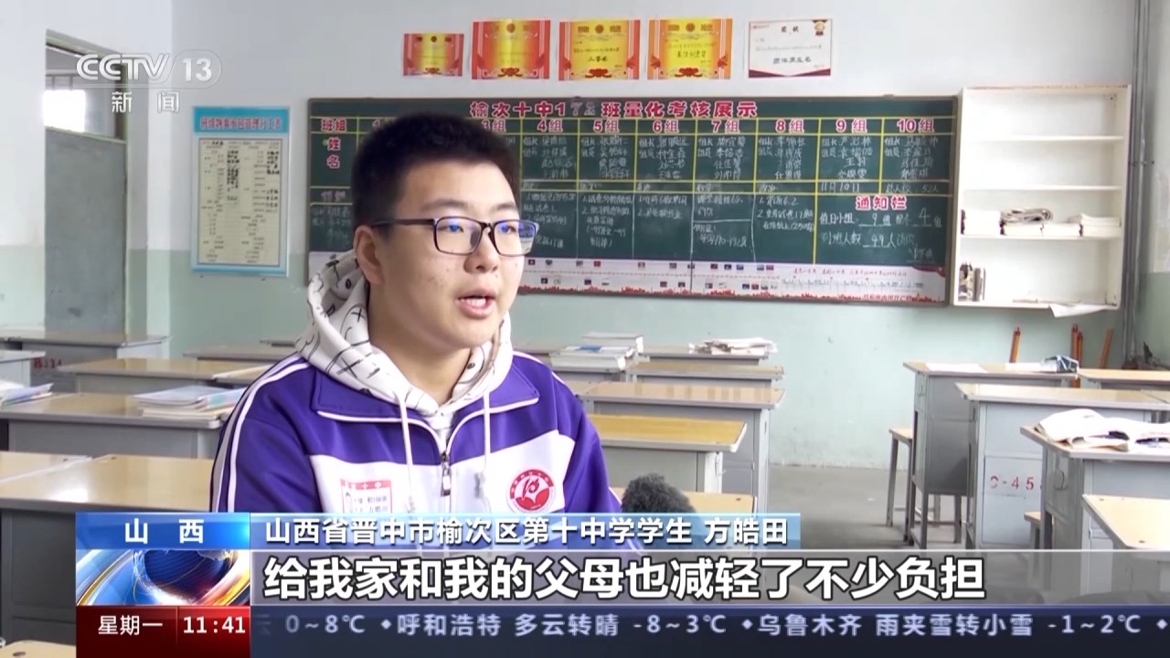 山西省晋中市榆次区第十中学学生 方皓田:学校为我们每个学生都上了校方责任险,算下来医疗费除医保报销部分以外,剩余的12000多元都给我报销了,给我家和我的父母也减轻了不少负担。