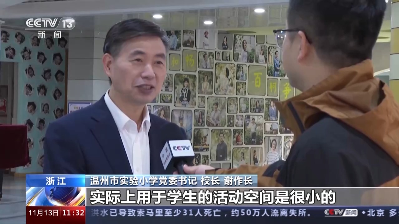 温州市实验小学党委书记、校长 谢作长:如果在高楼到一楼操场,休息十分钟,下楼已经来不及了,所以最合理的办法就是让我们的走廊每个楼道能够弄得越宽,每个楼层孩子就能够在自己楼道进行玩耍,这十分钟才真正能落地。