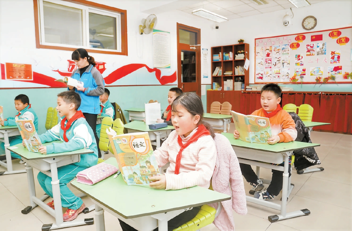 今天上午,门头沟区大台中心小学三年级学生在老师带领下朗读课文。昨天,门头沟区大台中心小学及附属幼儿园恢复原址办学,96名师生重返校园。“感恩”和“立志”成为返校第一课的主题词。记者 王海欣 摄