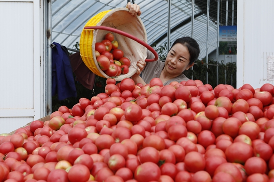 2023年7月,宁夏回族自治区固原市,隆德县联合蔬菜专业合作社负责人尹月荣在收纳即将上市的大棚西红柿。受访者提供