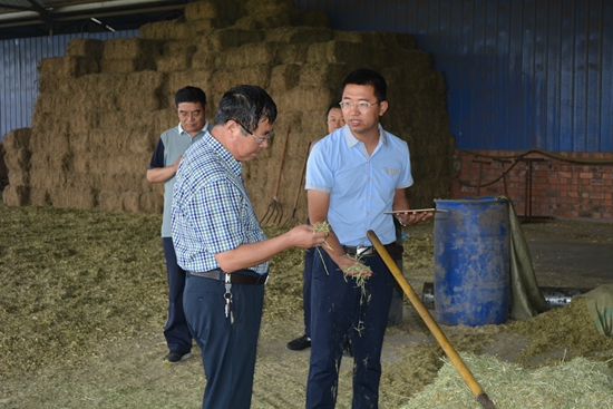 宁夏回族自治区吴忠市盐池县,以技术入股宁鑫生态牧场的90后返乡创业者冯欢(右一),向来访者介绍盐池县本地产的中草药饲草——柠条的加工使用情况。受访者提供