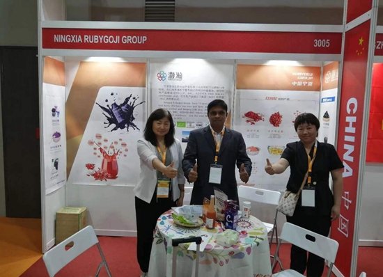2023年9月,马来西亚,宁夏灝翰生物科技产业有限公司总经理陈晓燕(左一)在当地参加国际食品饮料展会,推介枸杞系列产品。受访者提供