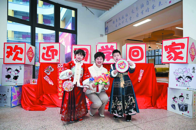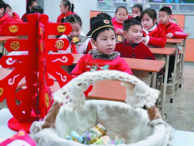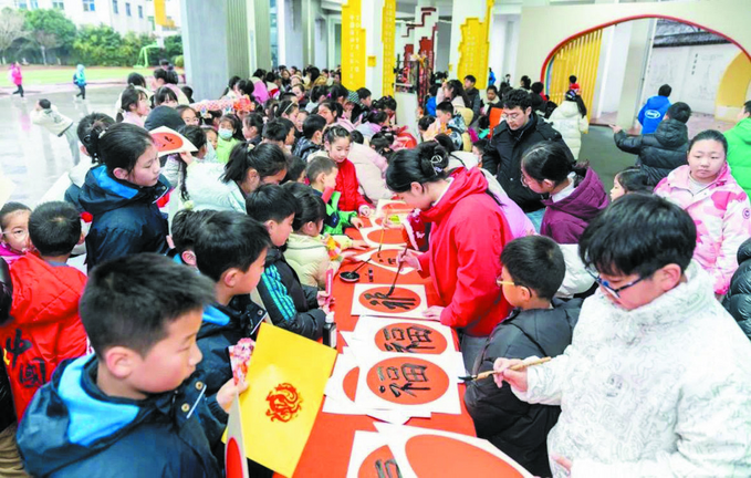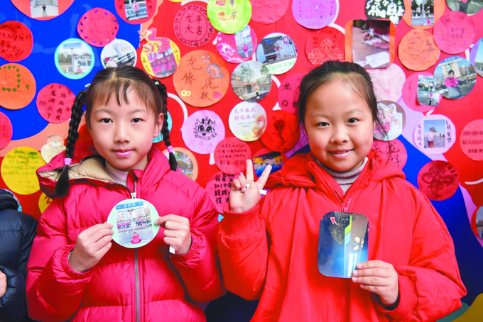 2月20日,常州市解放路小学的报到日开学活动通过“我在龙城过龙年”主题五育并举,让同学们为家乡龙城代言。学校重现了常州的一些古建筑:在“化龙巷”里,孩子们将亲手制作的手工作品挂在龙的身上,传递祝福与希望;在“洗砚池”旁,古老的汉字书写艺术在解小阳光娃的笔下焕发新的生机;在“新坊桥”上,解小“舞龙队”以锐意进取的崭新之姿迎接龙年新学期;在“舣舟亭”内,孩子们制作龙形拓印。