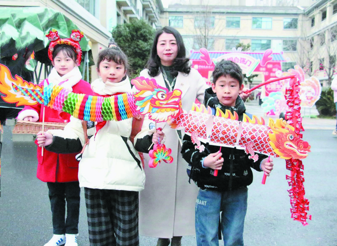 报到日,常州觅渡桥小学的同学们身着鲜艳喜庆的年服,手持精美的龙灯,拿着龙智造DIY作品,神采奕奕跃进龙门。