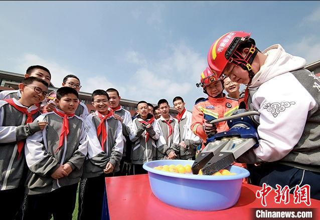 图为学生体验消防救援器具的使用。 陈先达 摄