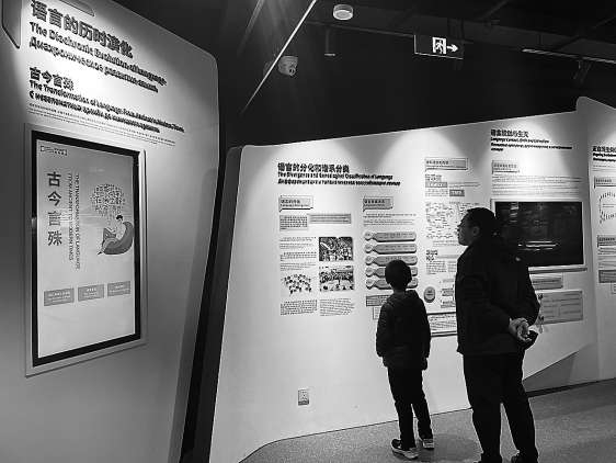 北京外国语大学世界语言博物馆,一对父子正在参观。