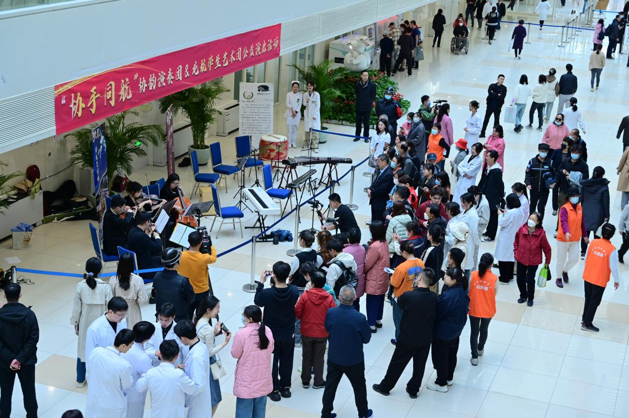 近日,来自北京航空航天大学学生艺术团弦乐四重奏团的学生们联手协和协韵演奏团,共同为北京协和医院东单院区的患者、家属和医务工作者带来了“协手同航”协韵演奏团联合北航学生艺术团公益演出活动。校团委书记刘洋,副书记赵圆和北航学生艺术团学生代表参加活动。