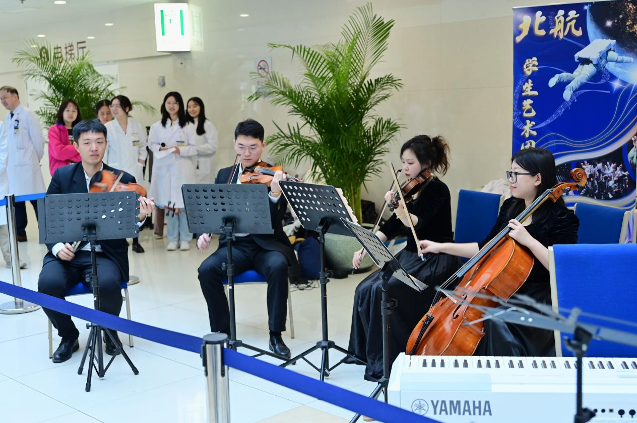 来自北航学生艺术团“福新高赵”“和音雅集”弦乐四重奏团的学生们带来了4首广受大众喜爱的歌曲,既有传统文化的动人呈现,又有西方音乐的经典旋律,以音乐疗愈患者,以艺术致敬医务工作者,吸引了不少观众驻足聆听。