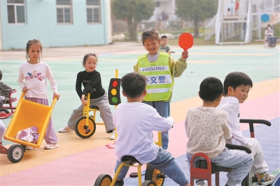3月25日,浙江省诸暨市暨南街道街亭幼儿园开展“小小交警进校园”安全教育活动,提高孩子们的交通安全意识。陈霞芳 摄