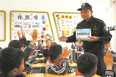 3月25日,浙江省湖州市德清县乾元镇中心小学开展“平安校园 拒绝欺凌”主题班会活动,乾元派出所民警向小学生普及法律知识。倪立芳 胡玉昌 摄