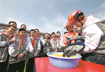 近日,中央民大附属中学呼和浩特分校学生在体验液压剪扩钳。陈先达 摄