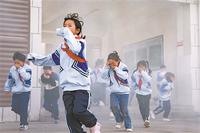 近日,安徽省合肥市肥东县浍水路小学学生在进行火灾逃生安全疏散演练。阮雪枫 摄