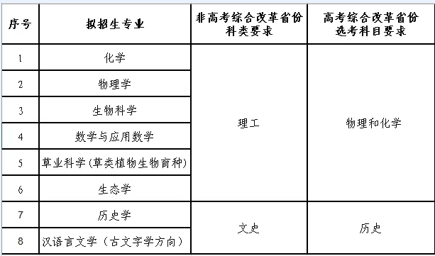 (一)学校基础学科招生改革试点招生工作在兰州大学本科生招生工作领导小组的领导下,由兰州大学招生办公室负责具体工作的组织和实施。我校在实施本简章的过程中将严格遵循公开、公平、公正和择优录取的原则,加强管理,严格程序,做到招生方案公开、选拔方法公平、录取标准公示。