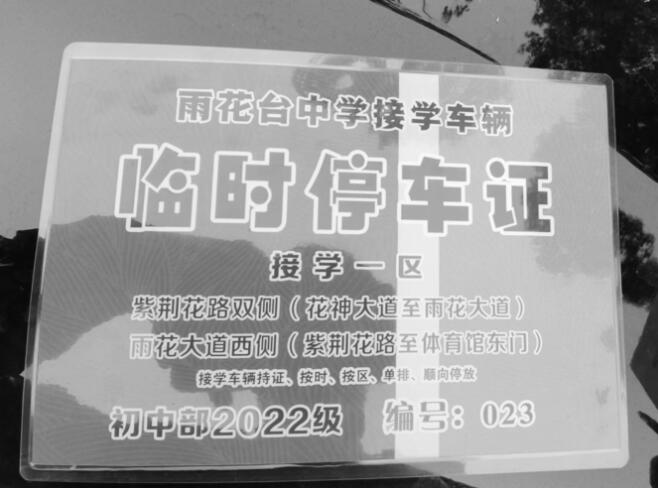 4月15日17时30分许,市民张女士驾车至玉兰路与紫荆花路交叉口附近,将车辆靠边停在玉兰路辅道上,这里距离南京雨花台中学校门约900米。“初二还有45分钟才放学,我18点再往雨花大道(与紫荆花路)路口挪挪,这样下车最多走100多米就能接到孩子了。”现场,她向记者展示了放在挡风玻璃下的临时停车证。