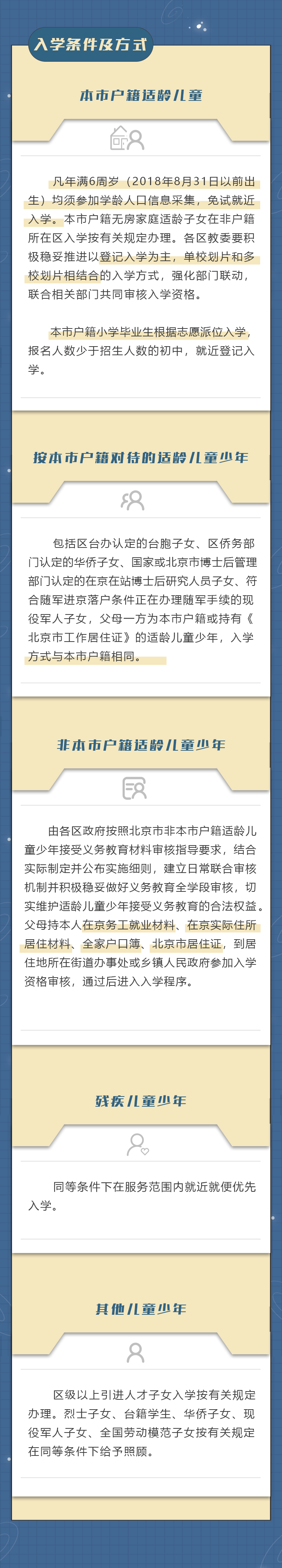 本市义务教育入学坚持免试就近的原则,小学入学采取登记入学为主、单校划片和多校划片相结合的方式,小升初采取免试、按志愿派位的方式。北京市将进一步优化入学服务平台,让数据多跑路、家长少跑腿,努力做到“一网通办”,推进入学工作更便捷、高效、透明。今年北京市义务教育入学重要时间安排与往年保持一致。
