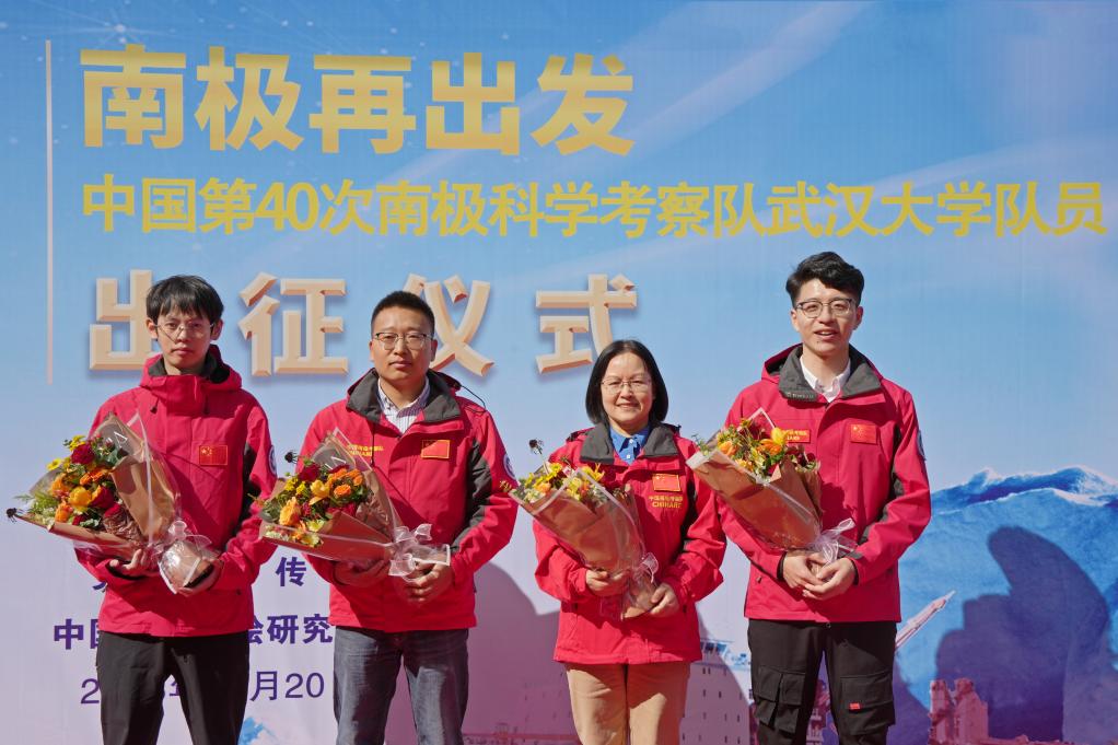 这是2023年10月20日中国第40次南极科学考察队武汉大学队员在出征仪式上,左一为褚馨德,右一为耿通。(受访者供图)