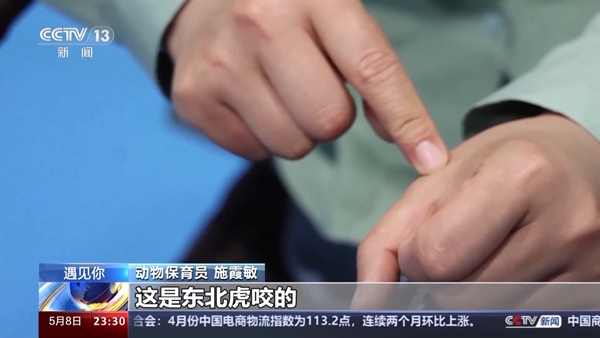 施霞敏:这是东北虎咬的,它吃肉的时候我去拿盆,咔了一口,半个牙进去,一个洞,最后就一个小疤,这种疤都褪不掉。