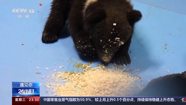 当天晚上,一只叫笨笨的小棕熊要开始戒掉8点这一餐的奶,逐步培养起自主进食的能力,以适应未来的“毕业生活”。因为戒奶,笨笨一直在叫,引得另外三只小熊也有些情绪焦躁,因此卫生清理消耗了不少时间。
