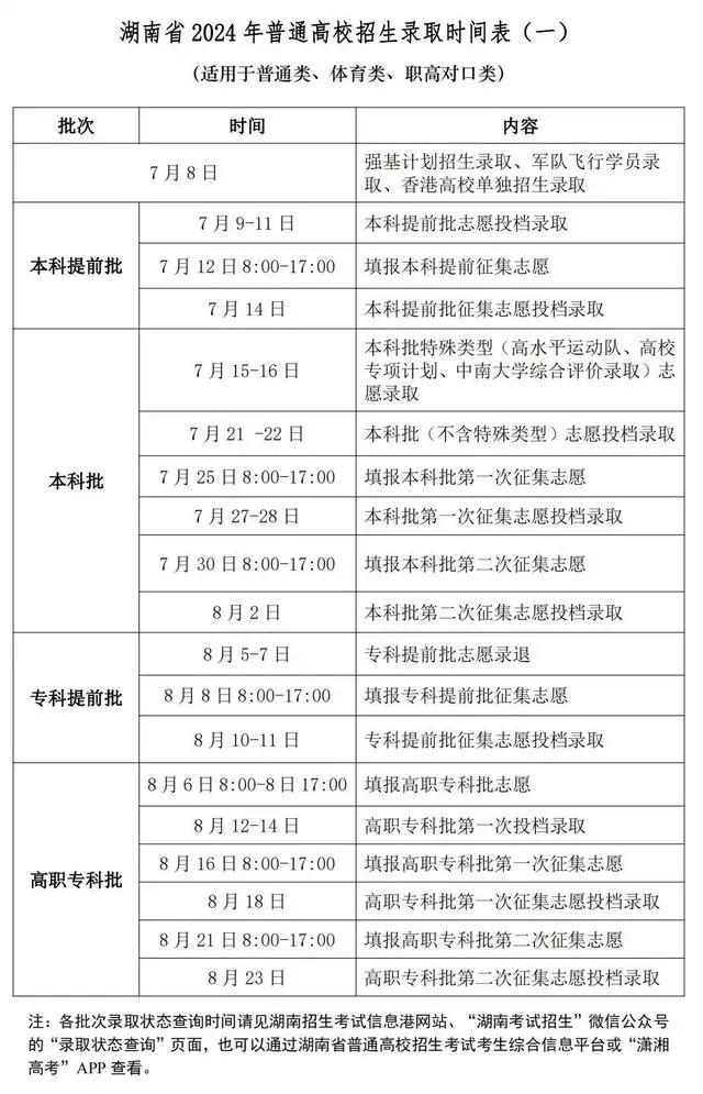 7月8日起,湖南高招录取工作正式启动。今年我省高招录取分为普通类、艺术类、体育类,其中普通类分为本科提前批、本科批、专科提前批、高职专科批4个批次。普通类本科批中先进行特殊类型(高水平运动员、高校专项计划、中南大学综合评价录取)志愿录取,再进行普通志愿投档录取。所有录取工作将于8月23日结束。为期47天。