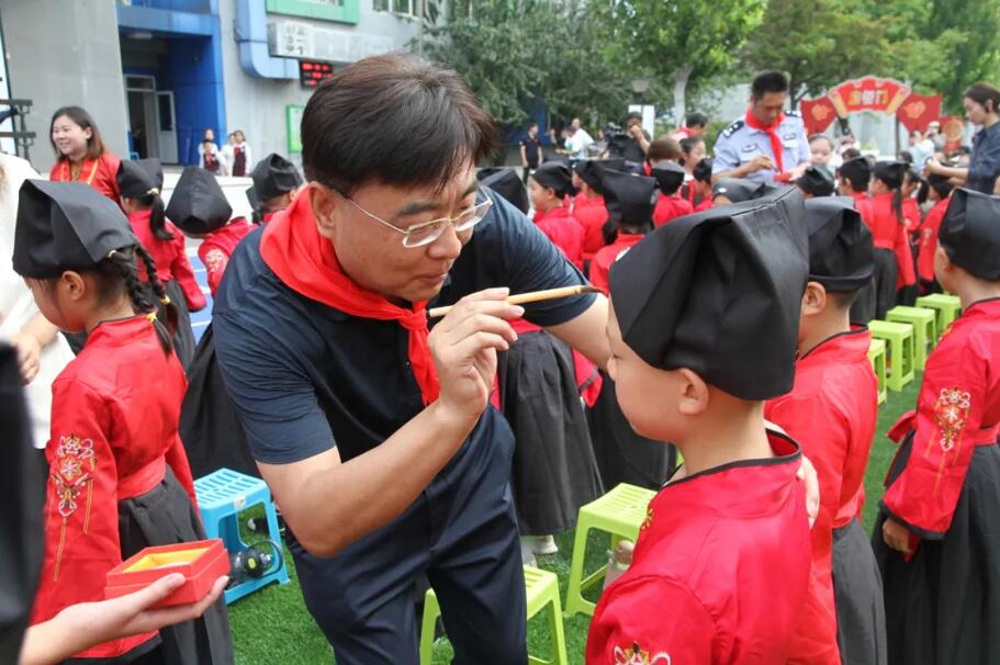 朱砂开智仪式中,领导和嘉宾依次在同学们的眉心处点上一个像“痣”一样的红点,希望学生今后的学习能一点就通。