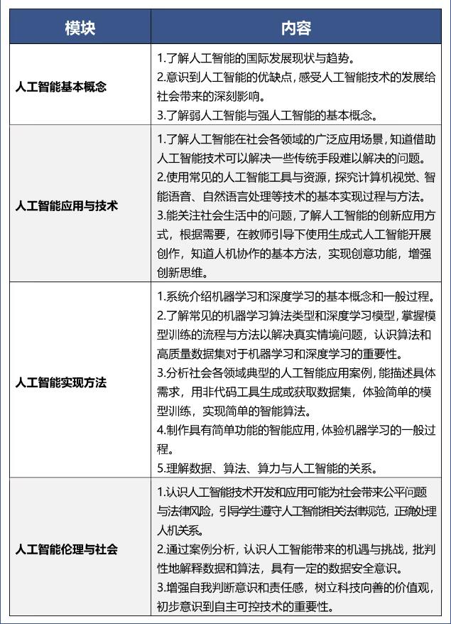 人工智能课程以全面提升学生人工智能素养为目标,面向全体学生提供人人必学、人人可学、人人愿学的基础性内容。课程包括人工智能意识与思维能力、人工智能应用与创新能力、人工智能伦理与社会责任三个方面,帮助学生从“基本了解人工智能”到“合理使用人工智能”再到“创新应用人工智能”,在人工智能项目实践中锻炼创新思维和问题解决能力。各学段将设置不同的教学目标——