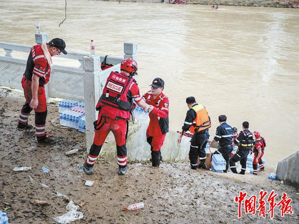 7月1日,贵州省榕江县杨家湾村,救援队通过冲锋舟向村里运送馒头、水、工具等物资。中青报·中青网记者 李隽辉/摄