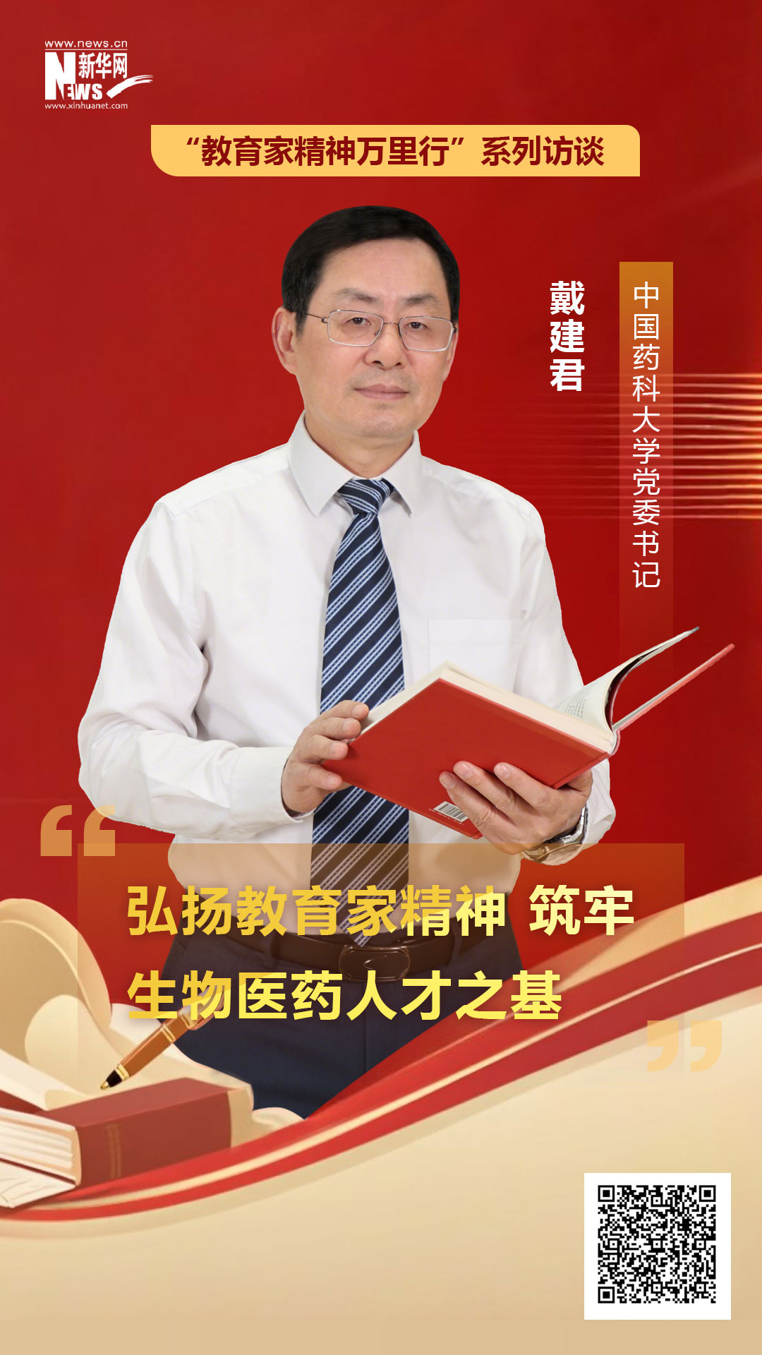 近日,中国药科大学党委书记戴建君在接受新华网专访时,介绍了学校在实施教育家精神铸魂强师行动,弘扬教育家精神等方面的创新实践。他表示,中国药科大学始终胸怀“国之大者”,坚持将大力弘扬教育家精神融入“为国家培养高级生物医药专门人才、创新生物医药领域核心关键技术”的时代使命,持续深化教师管理评价改革,不断强化有组织科研,着力打造一支师德高尚、敢为人先、兼济天下的药学“强国之师”,努力为教育强国建设筑牢生物医药人才之基。