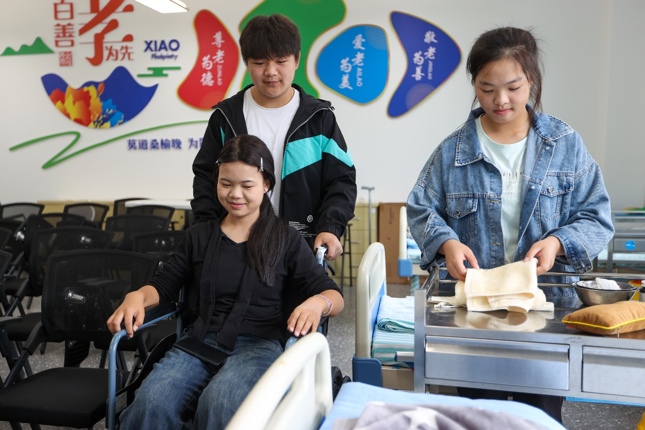 重庆城市管理职业学院智慧健康养老服务与管理专业公费培养生在实训中心上“老年生活体验课”,模拟照护实操践行养老服务理念