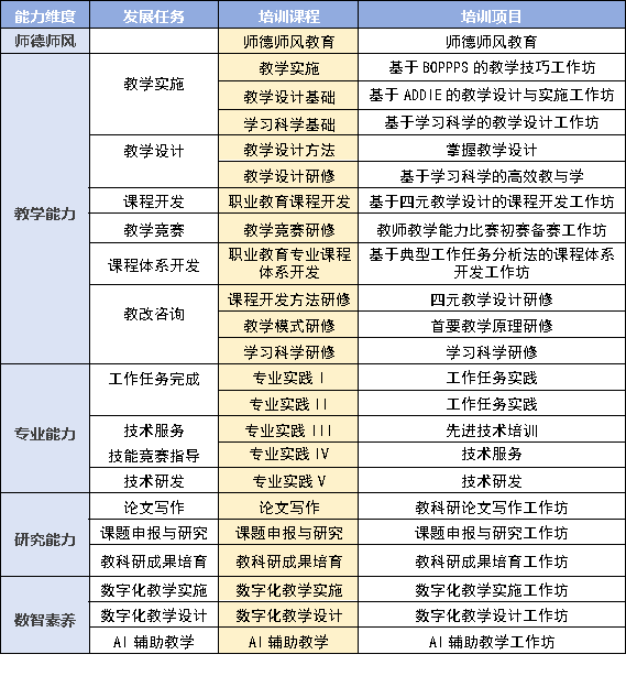 在培训内容设计上,研发团队深入分析每项发展任务,结合教学领域国际前沿研究成果,开发“问题解决导向”的培训内容。同时,自主开发了《基于四元教学设计的课程开发工作坊》《基于典型工作任务分析法的课程体系开发工作坊》《基于学习科学的教学设计》等9个教学法培训项目,形成“职业教育实用系统方法系列培训项目”,弥补职业院校教师教学法知识缺失,助力专家型教师培育。