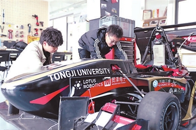 周末的上午,同样位于嘉定校区的同济大学大学生汽车科技创新实践基地,“翼驰”车队队长、汽车学院大四学生蔡昱颉和队员正为一辆燃油方程式赛车调试电机。这个基地是同济大学一众冠军车队的摇篮——过去10年,车队在国内外大学生方程式赛事中斩获37项大奖,车队中先后走出9家科技企业。