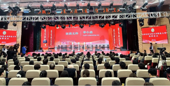 李小忠现场宣读了《教育部关于同意设置本科层次乌鲁木齐职业大学的函》。该批文标志着学校正式获准开展本科层次职业教育,是学校四十年办学积淀、持续改革创新取得的重大历史性突破,也是学校发展进程中具有里程碑意义的重要节点。