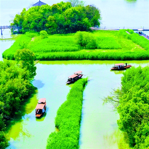 4月5日,浙江省德清县下渚湖国家湿地公园,游客乘坐摇橹船欣赏春景。近年来,德清县依托山水资源和良好的生态环境,乡村生态旅游发展得红红火火,产品业态丰富、富民增收效益提升。王 正摄(中经视觉)
