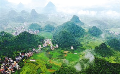 湖南省郴州市嘉禾县广发镇新元坊村,云雾、青山、田园与村庄交相辉映。