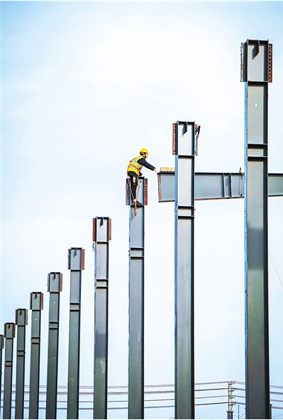 在江苏省宿迁市苏宿工业园区的皓峰电器智慧家电项目工地上,工人们正在安装钢结构厂房顶梁。