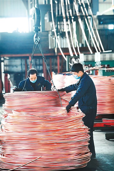 江西省丰城市循环经济产业园是全国绿色产业示范基地,图为园区内的企业员工正在加工铜产品。
