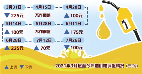 此次调价是2021年第十四次调价,也是年内成品油价的第二次下调。上一轮成品油下调发生在3月31日24时,当时国内汽、柴油价格每吨分别降低了225元和220元。今年以来,成品油调价呈现出“十涨两跌两搁浅”的格局,截至本次调价,2021年国内汽油价格每吨累计上调1375元,柴油价格每吨累计上调1325元。