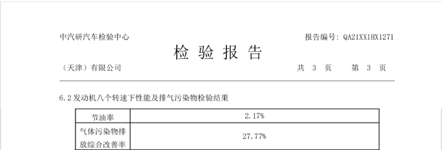 根据检测报告,以1/2000的体积比,将添加剂掺入油品中,在发动机八个转速下,THC(指排放的气体中含有碳氢化合物的总量)、NOx、CO等气体污染物排分别降低-15.06%、-3.75%、-8.96%,综合改善率为27.77%。同样条件下,油耗量率由添加前的275.61 g/kW·h 降低到269.64 g/kW·h,节油率为2.17%。